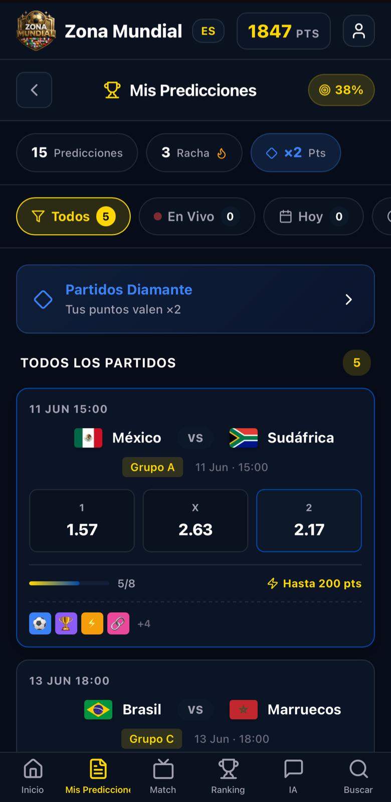 Partidos seleccionados con multiplicador especial de 3x para todas las predicciones.